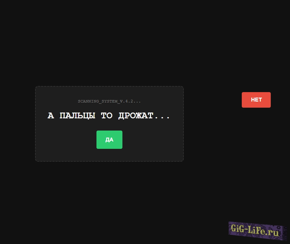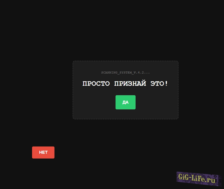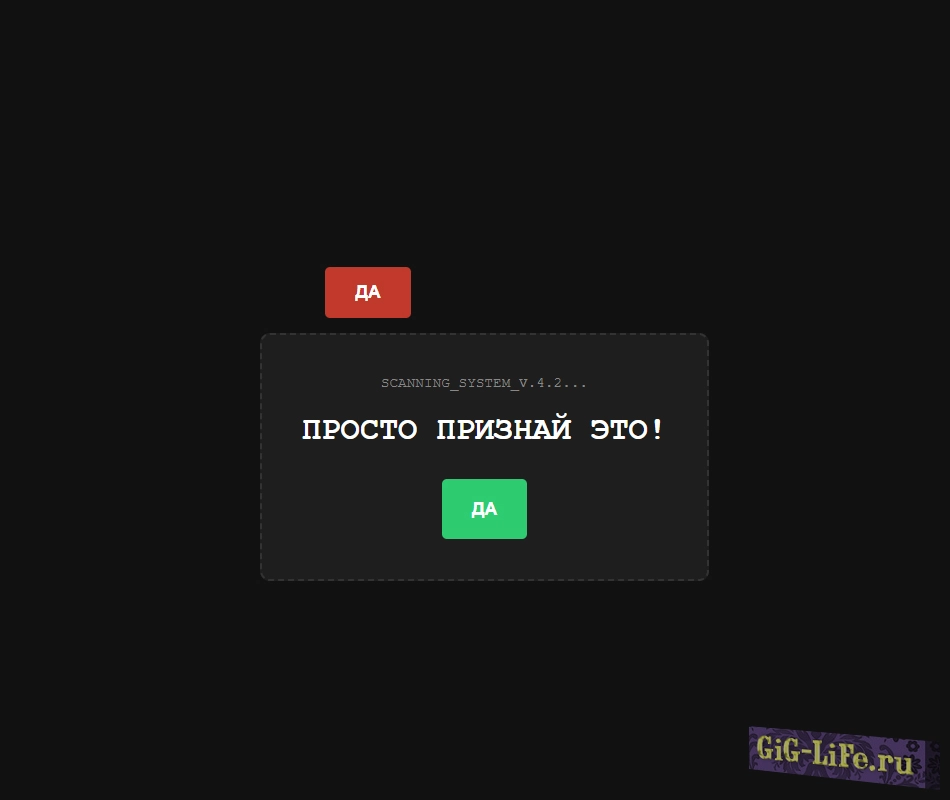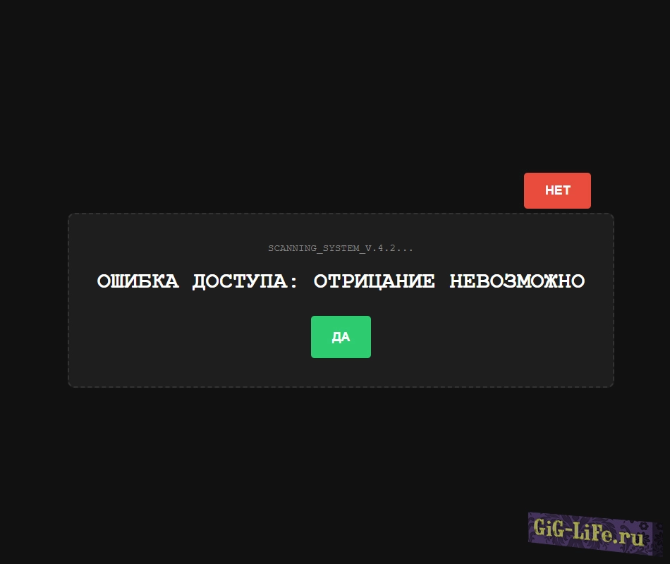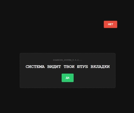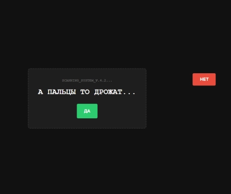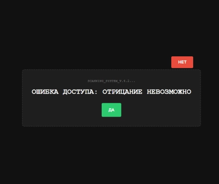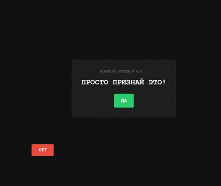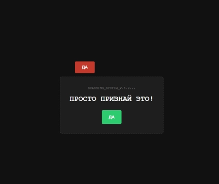 В отличие от обычных страниц, наш детектор предлагает «честный» выбор. Но как только пользователь пытается нажать «НЕТ», система начинает сопротивляться: заголовок меняется на подозрительный, кнопка ускользает, а интерфейс начинает «глючить».