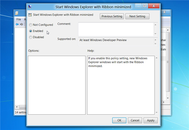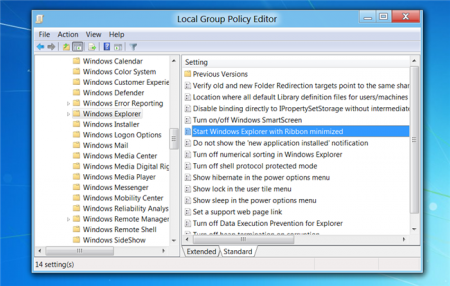 Computer Configuration –> Administrative Templates –> Windows Components –> Windows ExplorerДалее в правой панели найдите опцию "Start Windows Explorer with Ribbon minimized” (Запуск проводника Windows с минимизированным Ribbon) и дважды кликните по ней.
