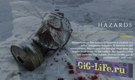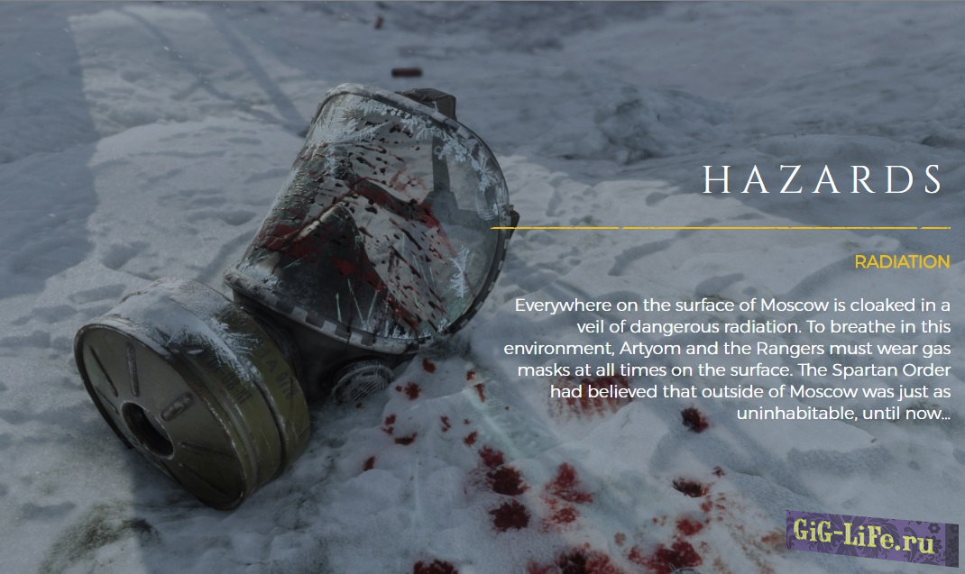 Главной опасностью зимой является радиация. Для того, чтобы дышать на поверхности Артему и остальным героям придется носить противогазы в течение всего времени нахождения на поверхности.