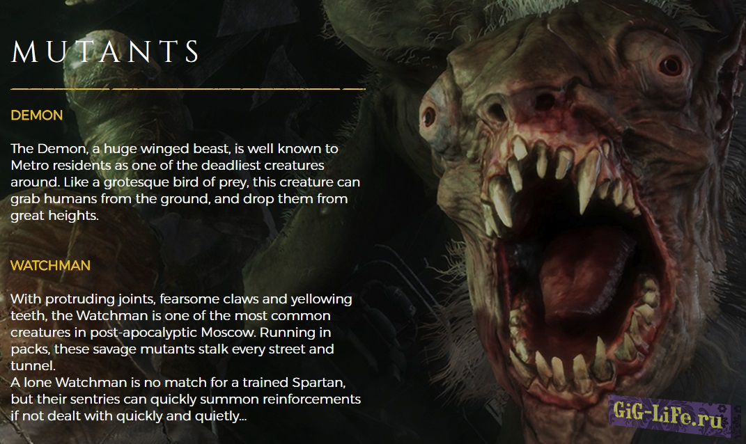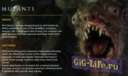 Самыми опасными мутантами будет демон и смотритель. Первый — это большой зверь с крыльями, несущий смертельную опасность. Способен поднять человека и сбросить его с большой высоты. Смотритель — это мутант, который поджидает жертву на каждой улице и в тоннелях. Передвигается быстро и тихо.