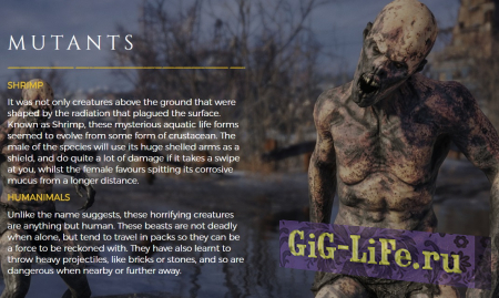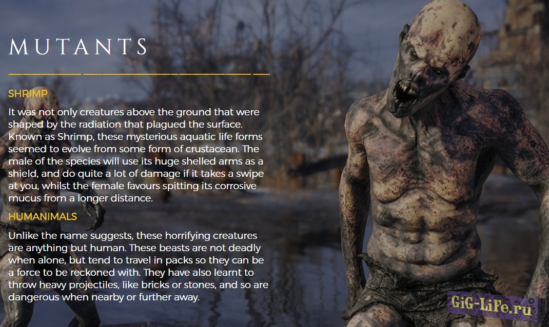 Среди мутантов повстречается Shrimp и Humanimals. Shrips — мутанты, живущие в воде. Мужские их особи используют свои огромные руки в качестве щита и наносят большое количество урона. Женские особи плюются кислотной слизью на большое расстояние.