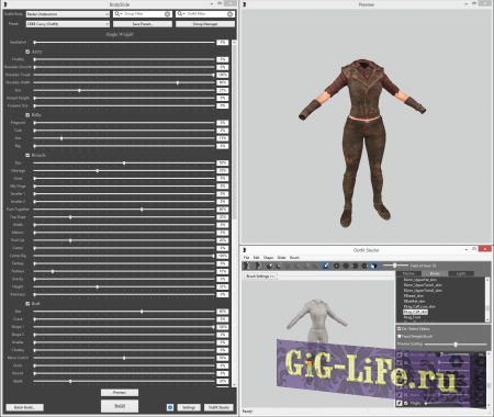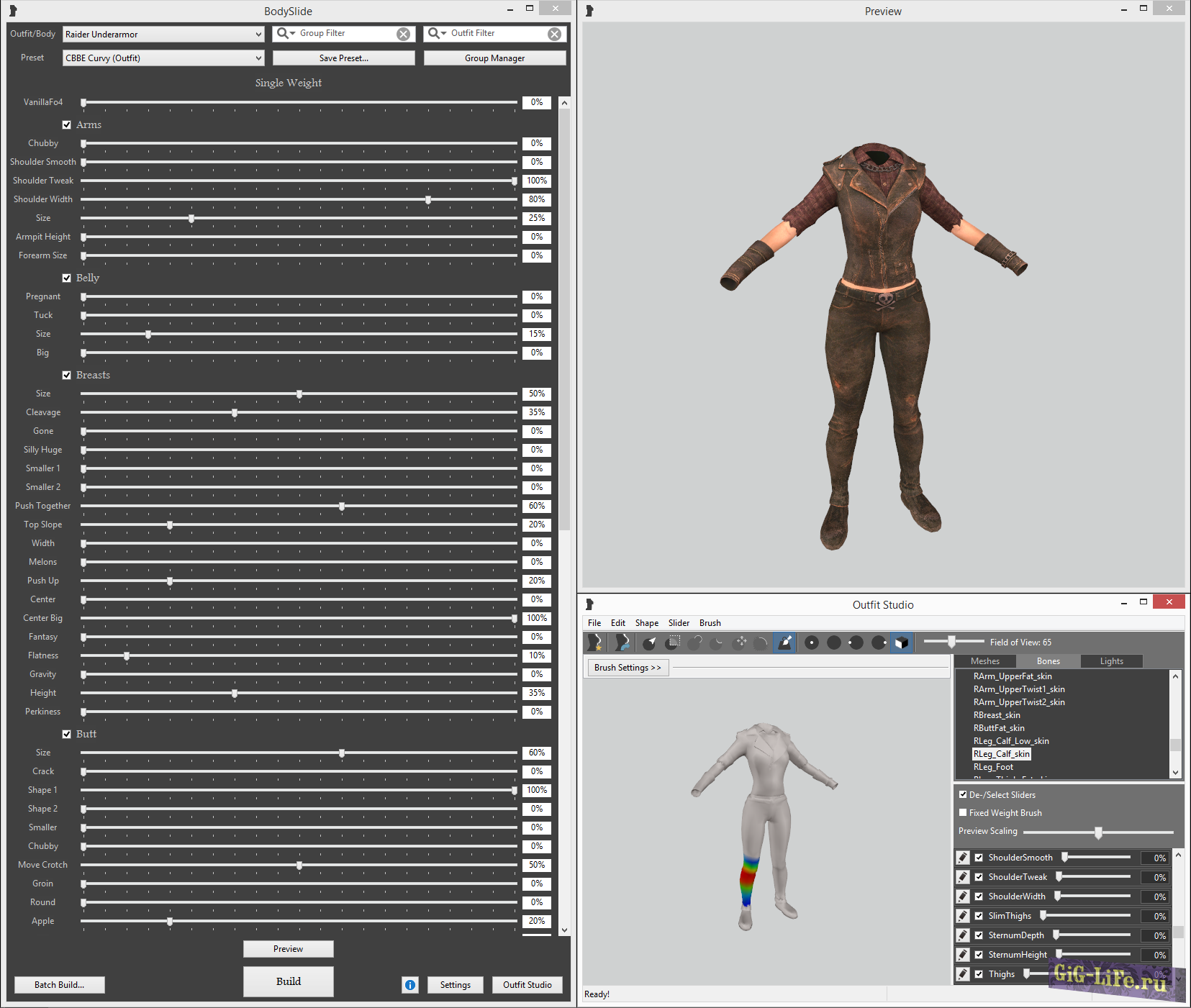 - Конвертировать наряды между разными формами тела, создавать свои собственные Бодислайд ползунки, правильную анимацию и редактирование весовых meshes.