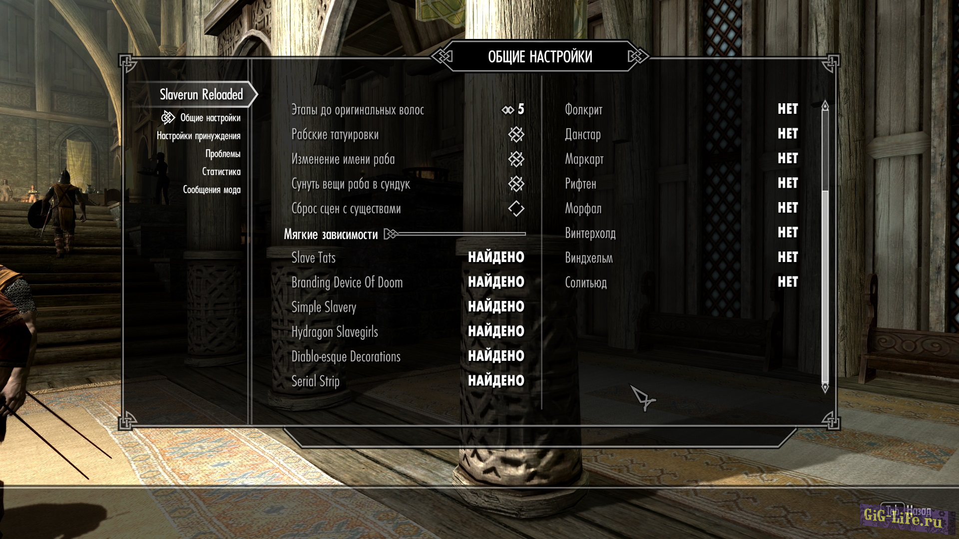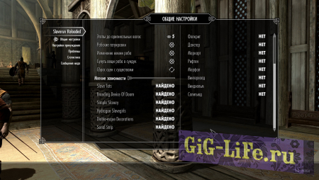 Также стоит подметить, что мод взаимодействует с другими модами на эту тему (в настройках тоже есть список), частично расширяя его возможности. Будут доступны дополнительные функции, такие как «поставить клеймо специальным двемерским устройством непослушной рабыне», перепродать рабыню… Еще косметические улучшения.
