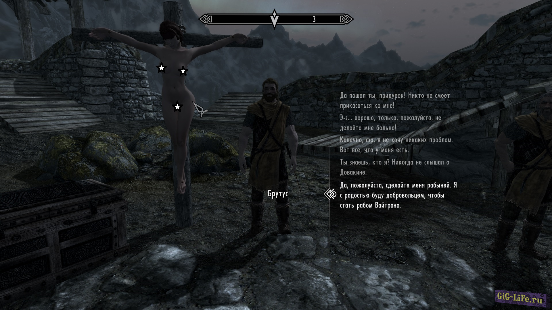 Учитывая большое количество текста в моде, могут попадаться опечатки или банальные ошибки, некоторые всплывающие тексты в верхнем левом углу остались без перевода. Увы, но получается набор символов. Имена рабыни тоже не отображаются на русском, но вы ничего от этого не теряете.