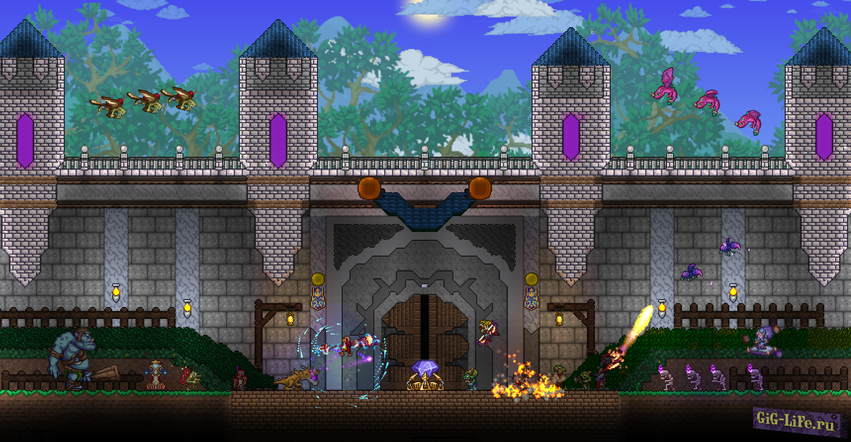 Terraria (Террария) — довольно популярная на сегодняшний день игра, которая перенесет тебя в сказочный мир. Данный проект выполнен в жанре песочницы с довольно открытым красочным миром. Здесь у тебя будет полная свобода в действиях. Единственное, что может тебя ограничить, это смена дня и ночи, а также различные жуткие твари, которые вылазят из своих пещер. Это говорит о том, что в игре нужно постоянно быть на чеку, а также незамедлительно обустроить себе безопасное убежище.