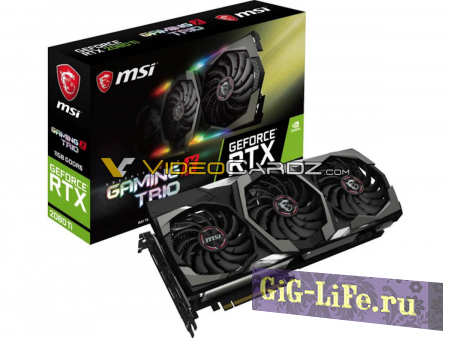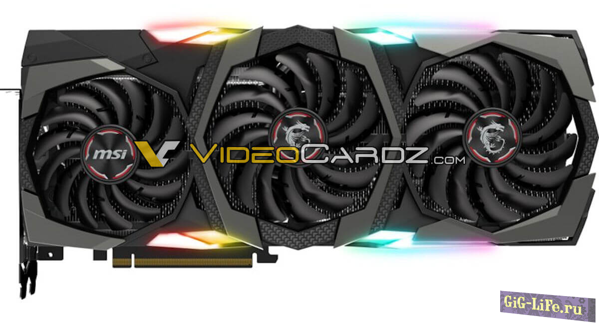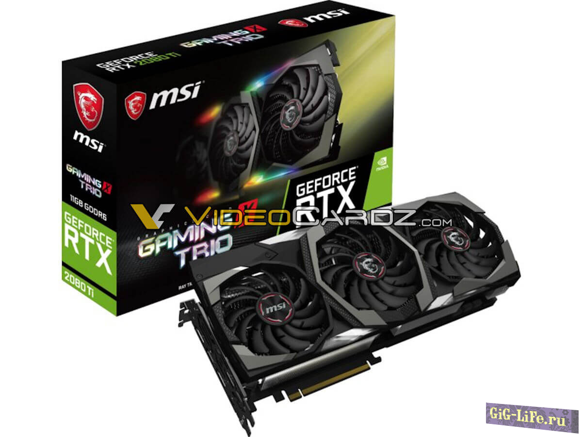 На фото показана геймерская модель видеокарты GAMING X TRIO от компании MSI. GeForce RTX 2080Ti имеет три кулера с RGB-подсветкой, поддержку NVLink, разъем Type-C VirtualLink и два 8-контактных разъема питания.