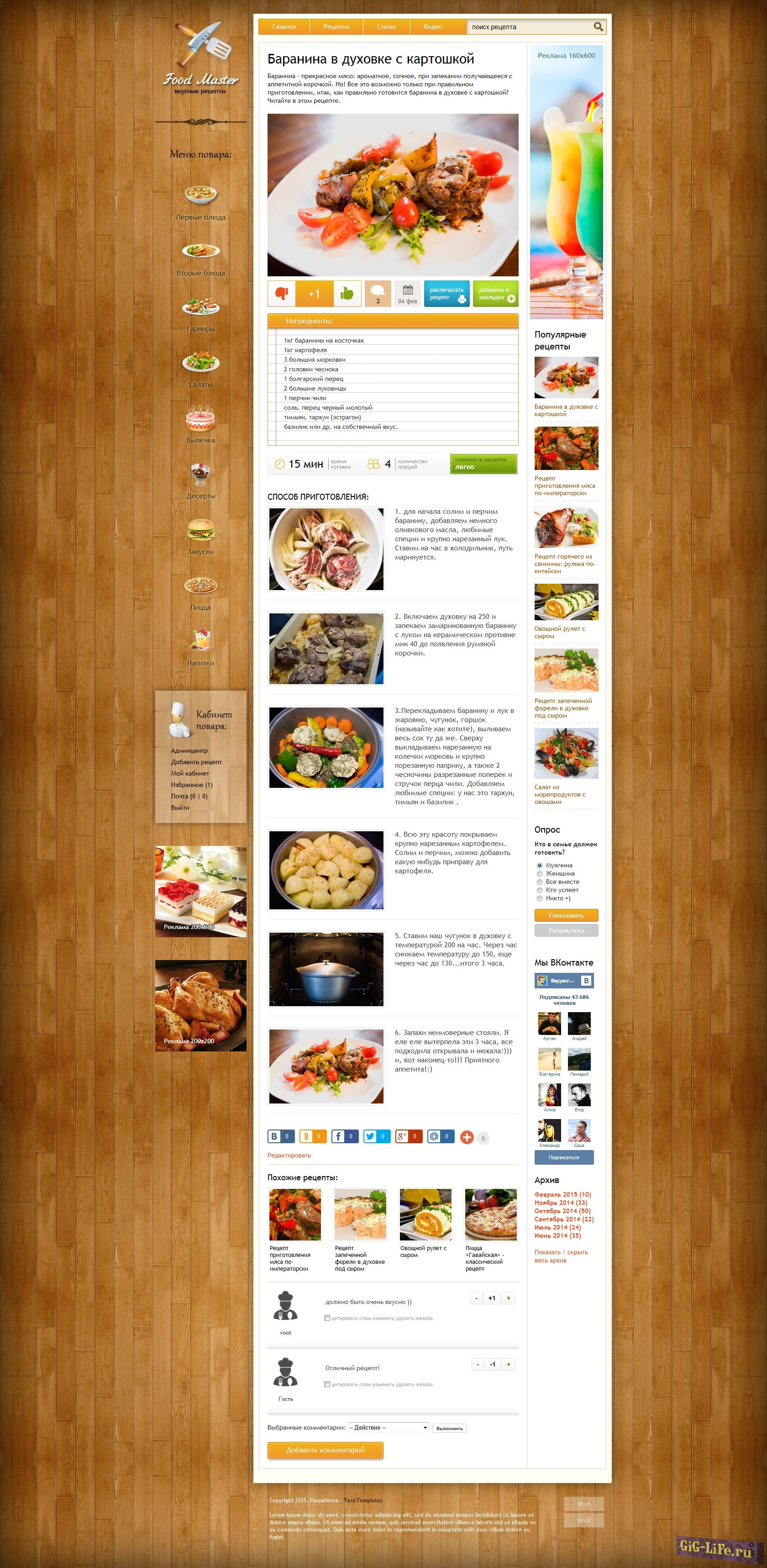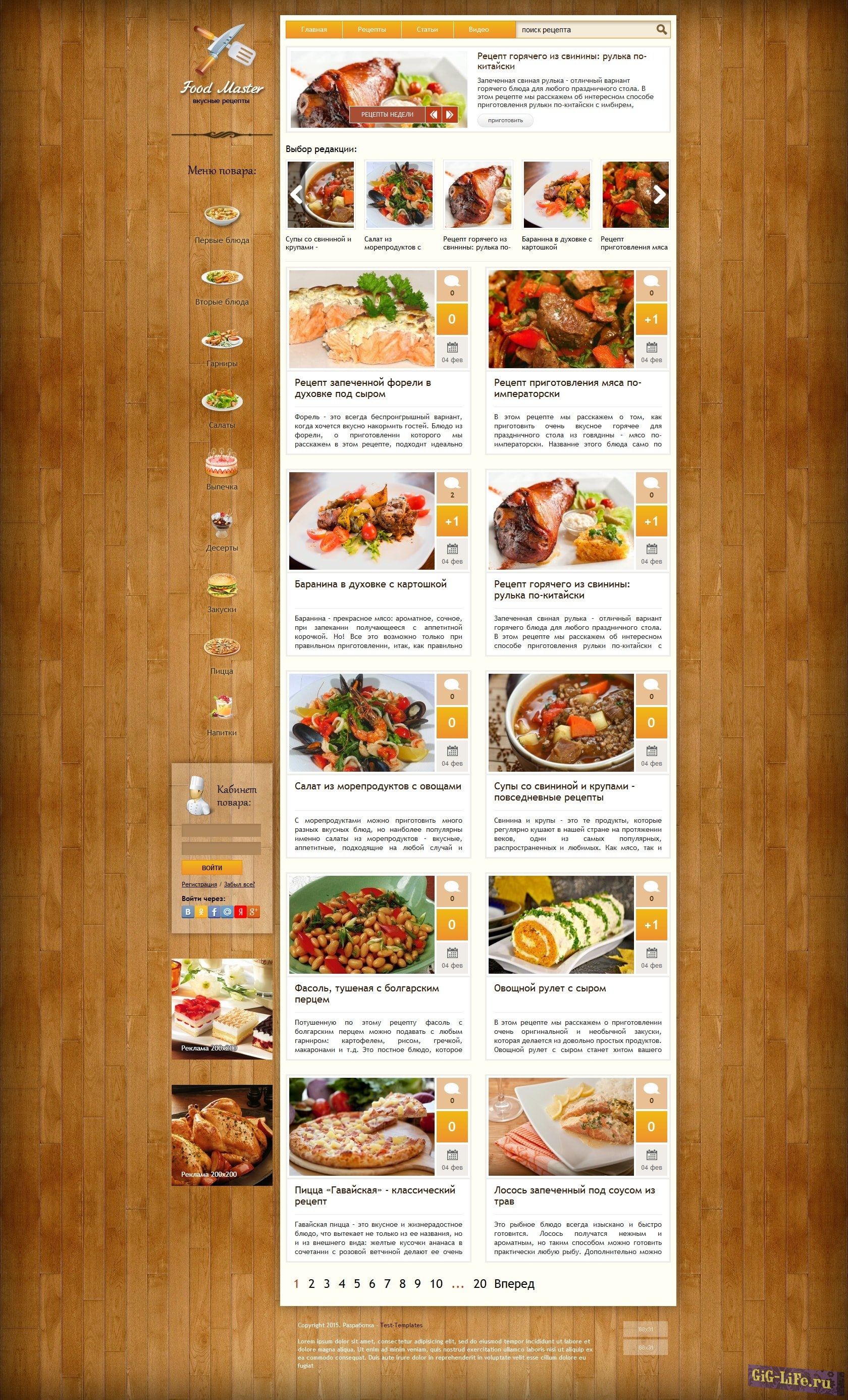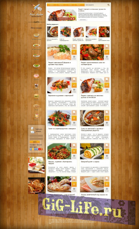 Привлекательный шаблон кулинарной тематики. Если у вас сайт с рецептами, то этот шаблон идеально для него подойдёт. Ведь он не только красивый, но и функциональный. Дизайн адаптивный, что позволит посетителям вашего сайта просматривать рецепты как с компьютера, так и с планшета и телефона.