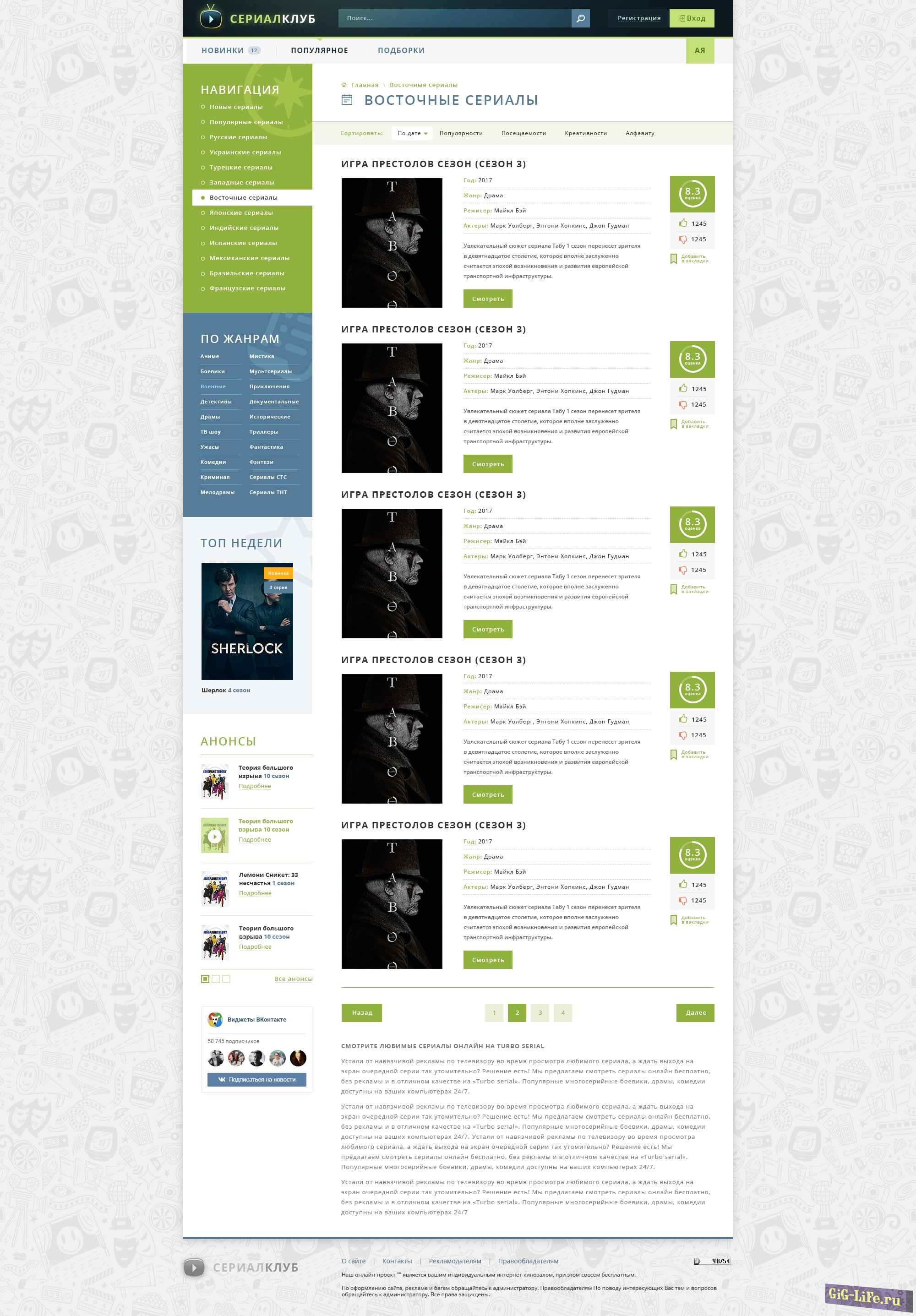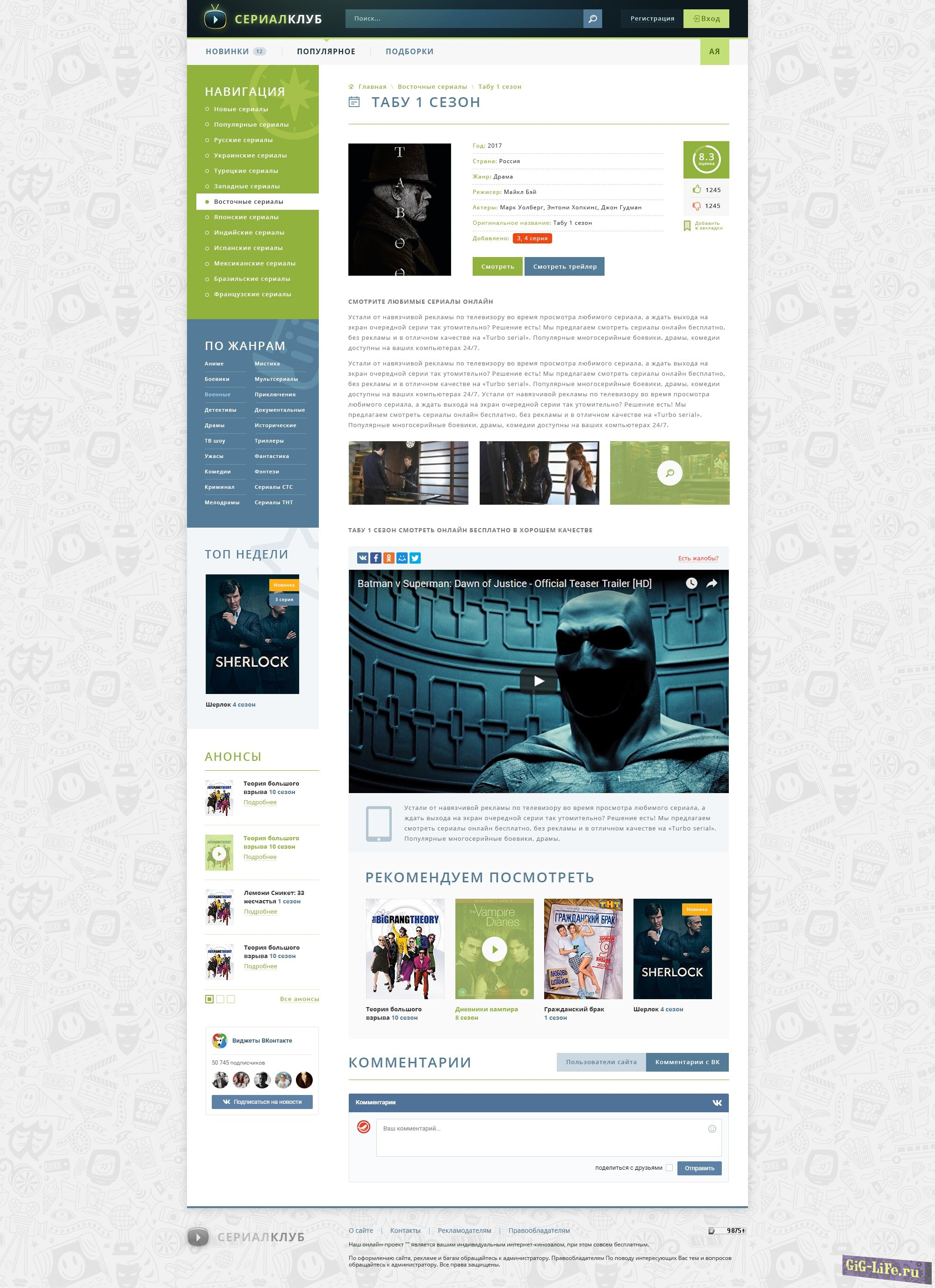 Рейтинг тоже реализован нестандартно. Сериалу можно повышать или понижать рейтинг, выводится общая оценка. В полной новости можно встроить комментарии от Вконтакте и использовать их вместе со стандартными.