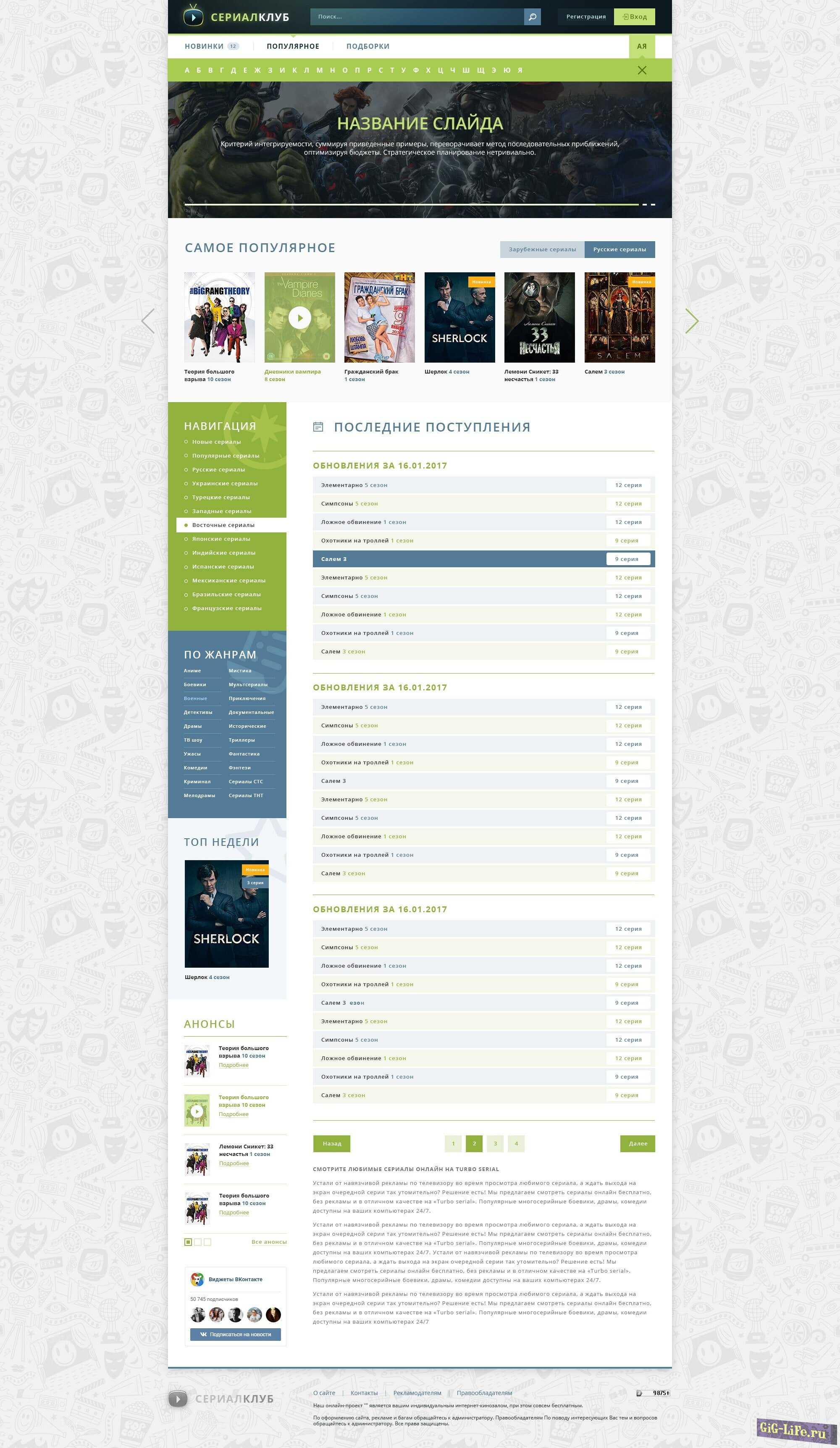 В шапке сайта расположена панель, на которой логотип, поиск по сайту и профиль пользователя. Чуть ниже большая картинка на всю ширину со слайдером популярных сериалов. Можно вывести буквенный каталог.