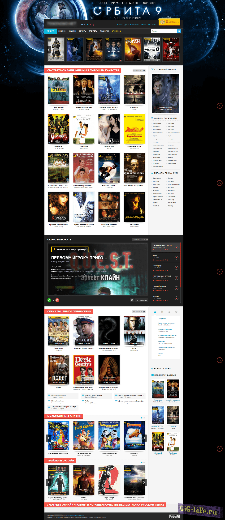 Многофункциональный шаблон для сайтов кино тематики KinoLove. Фон у шаблона тёмный, основная часть – светлая. Однако смотрится это красиво. Шапка оформлена в стиле фильма про космос. Краткие новости выводятся в виде постеров с названиями. На постере можно вывести дополнительное поле с качеством фильма либо с озвучкой. Имеется несколько вертикальных меню в правой колонке: фильмы по жанрам и сериалы по жанрам. На всю ширину сайта есть специальной блок «Скоро в прокате», в котором показываются предстоящие кинопремьеры и информация о сюжете. Сериалы и мультфильмы оформлены с использованием слайдера.
