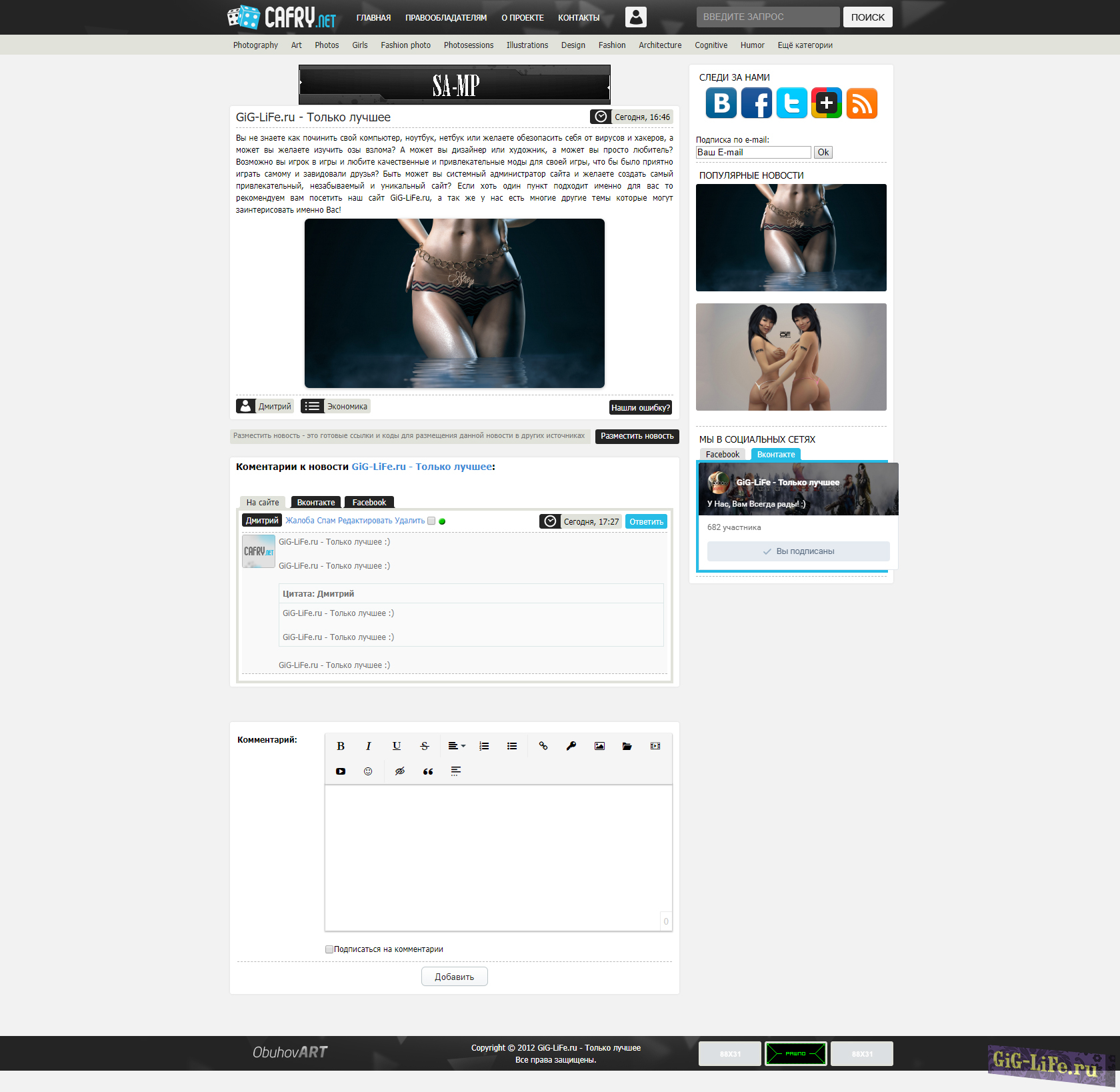 В шаблоне структурированное верхнее меню навигации, с подразделами, поиском, всплывающим информационным табло пользователя. Правый блок используется для информирования о последних наиболее популярных новостях (публикация) + ссылки на группы в соц сетях (имеется отдельный баннер с виджетами), функция подписки на новости по e-mail рассылке.